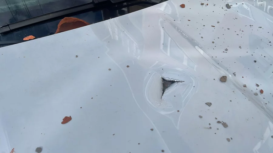 Bursa'da Keles ilçesi merkezinde, yol üzerindeki 3 katlı bir binanın çatısındaki çürüyen baca gürültüyle devrildi. Bacadan kopan beton ve tuğla parçaları, evin önünde park halinde bulunan 16 BZP 165 plakalı otomobilin üzerine düştü.