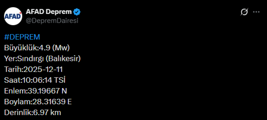 BURSA, 11 Aralık 2025 Perşembe, 10:17Bursa'da hissedilen deprem paniğe yol açtı: İlk verilere göre merkez Sındırgı, büyüklük 4.9