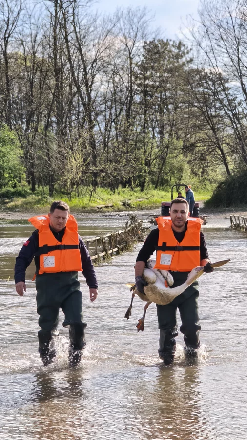 İhbar üzerine bölgeye İnegöl İtfaiye Arama Kurtarma ekipleri sevk edildi. Özel kıyafet ve can yelekleriyle suya giren ekipler, zorlu şartlarda çalılıkların arasına sıkışan pelikana ulaştı.