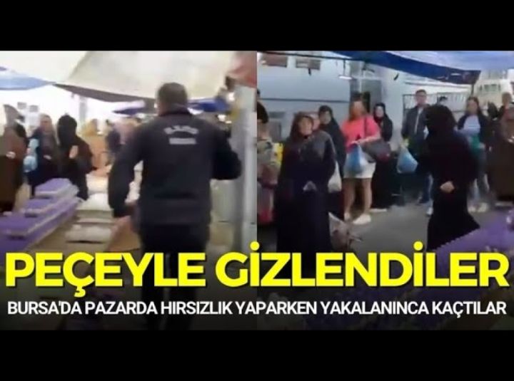 Bursa'da kurulan semt pazarında hırsızlık yapmak isteyen yüzleri peçeyle kapalı 2 kadın şüpheli, esnafın dikkati sayesinde fark edildi. Koşarak kaçan şüphelilerin peşine bazı vatandaşlar düşerken, o anlar kameraya anbean yansıdı. Pazarda hırsız esnaf kovalamacasında hareketli görüntüler yaşandı. Olay, Yıldırım ilçesi Namazgâh Mahallesi'nde kurulan semt pazarında meydana geldi. Edinilen bilgiye göre, pazara gelen yüzleri peçeyle kapalı iki kişi, tezgâhlardan hırsızlık yapmak istedi. Durumu fark eden bazı esnaflar, hemen müdahale ederek şüphelileri uyardı. Esnafın tepki göstermesi üzerine paniğe kapılan şüpheliler, pazardan koşarak uzaklaşmaya başladı. Bu sırada çevredeki bazı vatandaşlar da şüphelilerin peşine düştü. Pazarda yaşanan aksiyon dolu anlar, çevredeki güvenlik kameralarına ve vatandaşların cep telefonu kamerasına yansıdı.