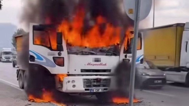 Bursa Çevre Otoyolu'nda seyir halindeki bir kamyonda yangın çıktı. Alevler kısa sürede tüm aracı sararken, o anlar cep telefonu kamerasına yansıdı.