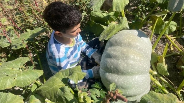 Bahçesindeki kabakları hasat ederken ikisinin 40 kilograma ulaştığını gören çiftçi, mutluluktan iri kabaklarıyla konuştu, onları elleriye okşayarak sevdi.